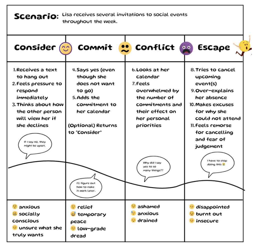 We created the “Academic Overcommitter” persona after observing a recurring pattern: participants consistently accepted social invitations with genuine intent to attend, yet cancelled last-minute when academic demands intensified (e.g. office hour, midterm, etc.). Interviewees described feeling torn between maintaining friendships and pursuing academic excellence, often overestimating their capacity to balance both. They reported saying yes to social plans during calmer periods, only to cancel when assignments, exams, or research deadlines suddenly felt urgent—even when these deadlines were known in advance. We synthesized these behaviors into the “Academic Overcommitter” persona, which represents users whose commitment-making and flaking patterns stem from fluctuating academic anxiety and a persistent underestimation of their workload.