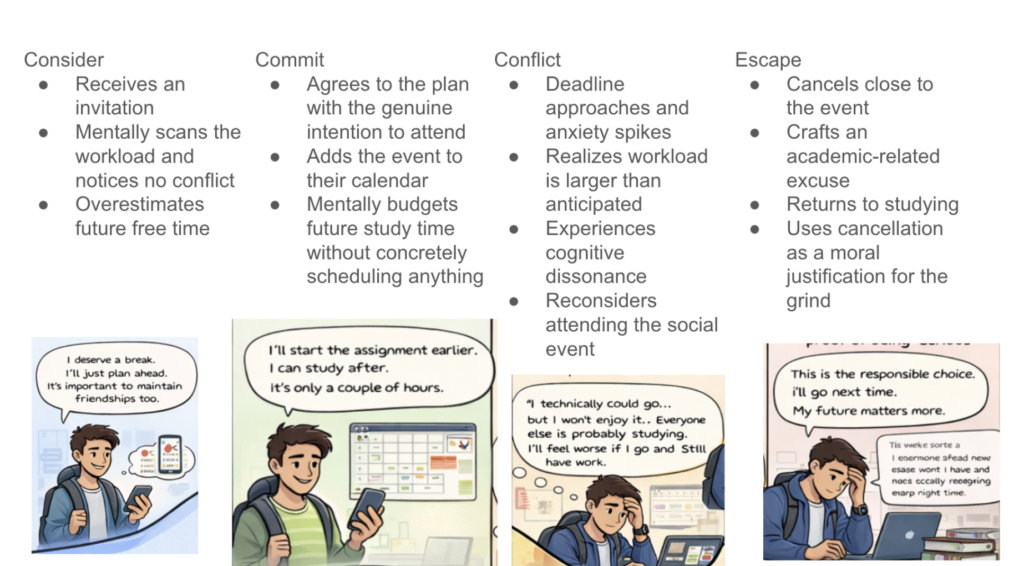 Marcus, “The Academic Overcommitter”, is a student who is academically driven. His goal is to achieve academic excellence and secure future opportunities (internships, grad school, career prospects) while maintaining some semblance of social connection. His motivations include, preserving academic standing, meeting personal achievement standards, and avoiding falling behind peers. Marcus optimistically commits to social plans during low-stress periods, but cancels when academic pressure mounts—even when he technically has time—because he cannot mentally justify “fun” when work remains incomplete.