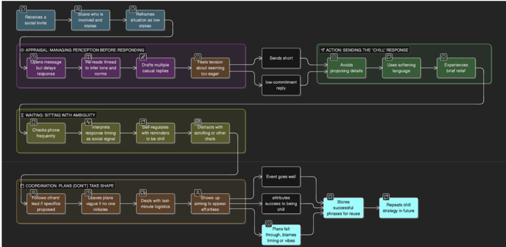 His key behaviors reflect this tension. He delays replies to avoid seeming eager, keeps his language deliberately casual, and downplays interest to avoid rejection. This creates an internal paradox: the more he tries to appear chill, the less chill he actually feels. His pain points stem from this gap between internal effort and external presentation: his communication style amplifies ambiguity rather than resolving it, which means plans stay vague, commitments stay soft, and follow-through suffers from a desire to avoid “killing the vibe” with directness. He succeeds at fitting in, but often at the cost of authenticity and clarity.