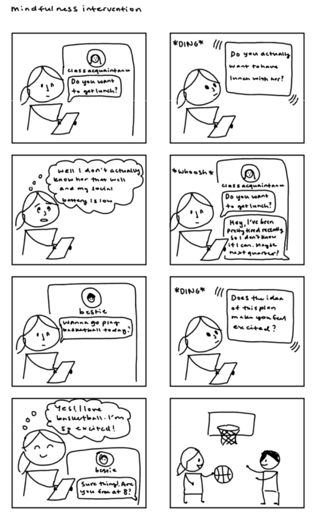 Our prototype addresses the problem of scheduling friction by taking the user’s schedule and finding compatible times to make plans; additionally, our prototype promotes reflection by synthesizing users’ self reported behavior into an evaluative numerical score. Our scheduling component has a data privacy dimension, while scoring raises ethical implications.