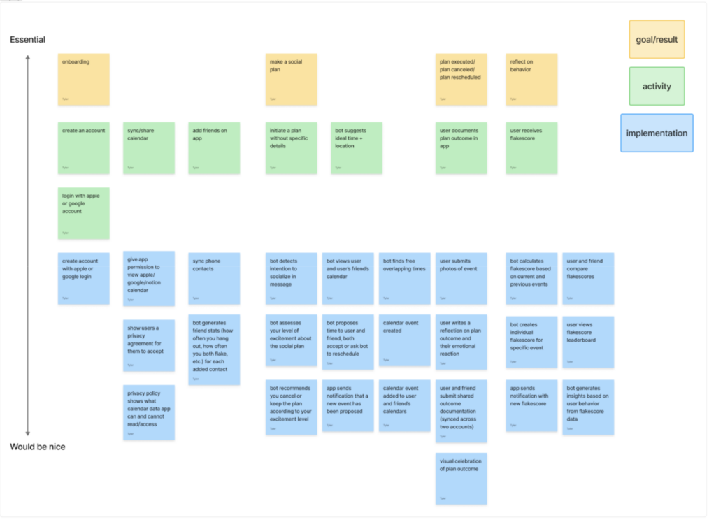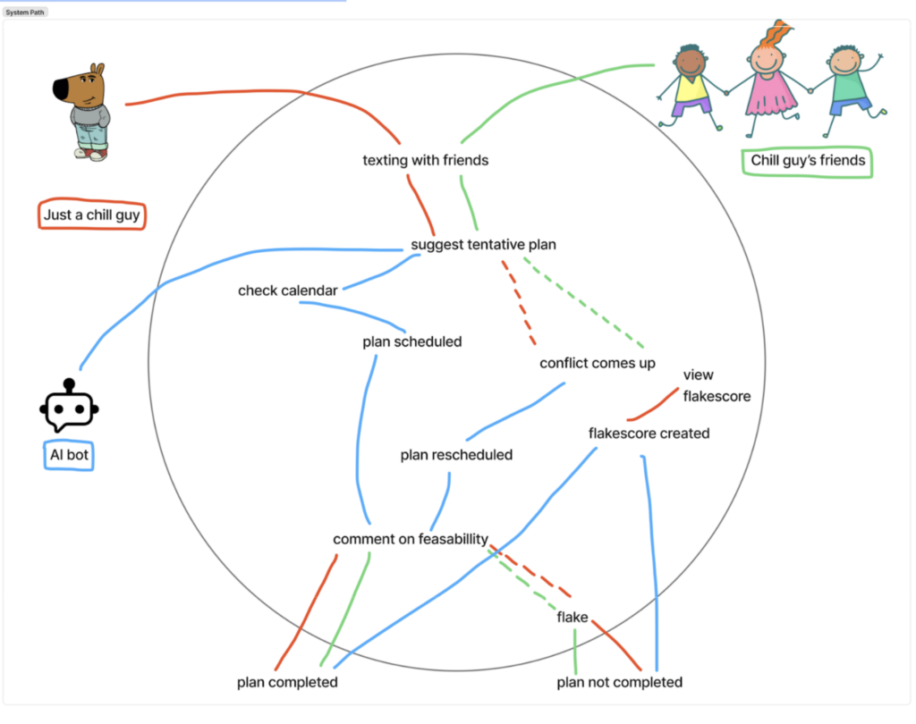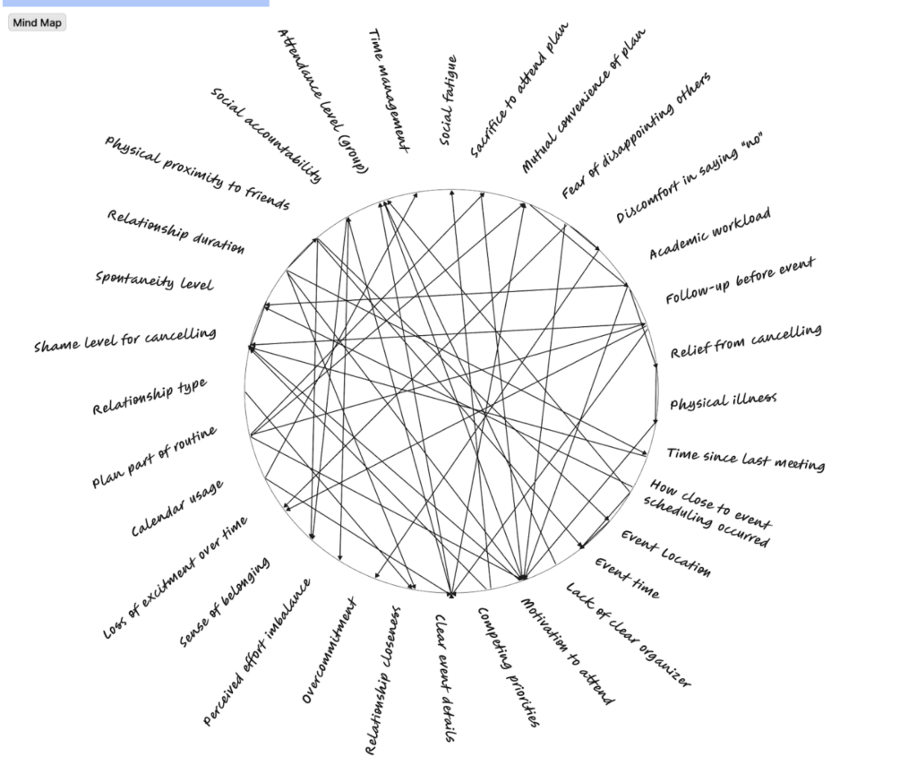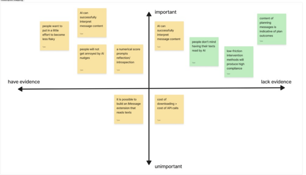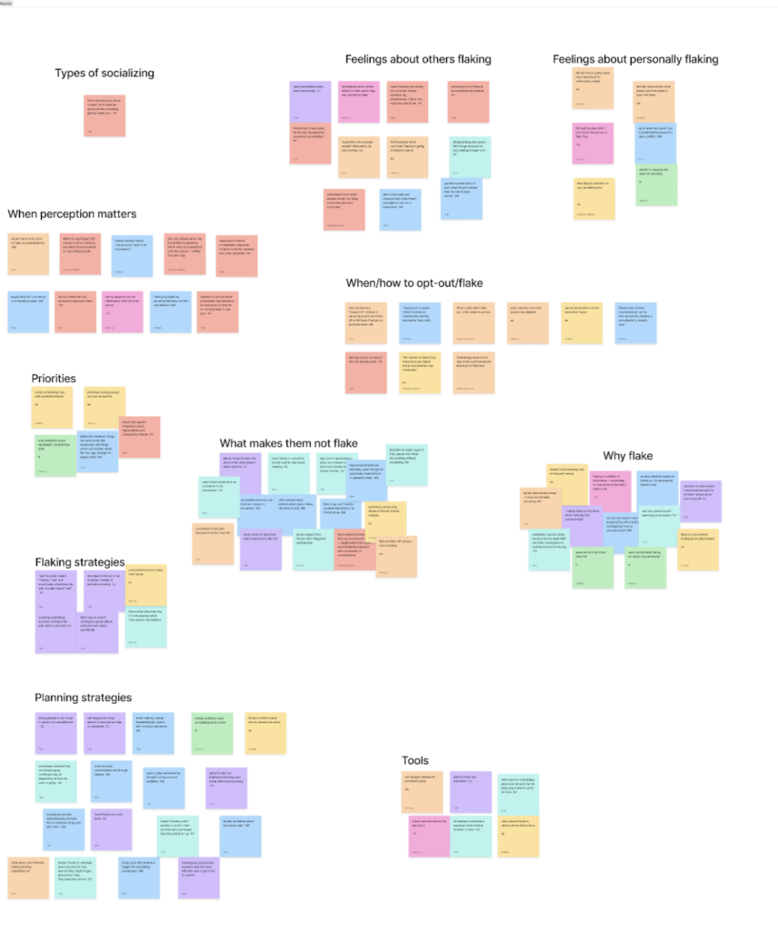 Across our grounded theories, a few consistent themes emerged. Follow-through is strongly tied to personal investment, both in the plan and the co-participants involved, and people often feel neutral or even relieved about canceling, particularly when they feel their reason is defensible or the relationship is strong enough to absorb it. Perhaps most meaningful for our design was the finding that people often lack an accurate picture of their own social habits — several participants were genuinely surprised by how frequently they flaked only after completing the diary study.