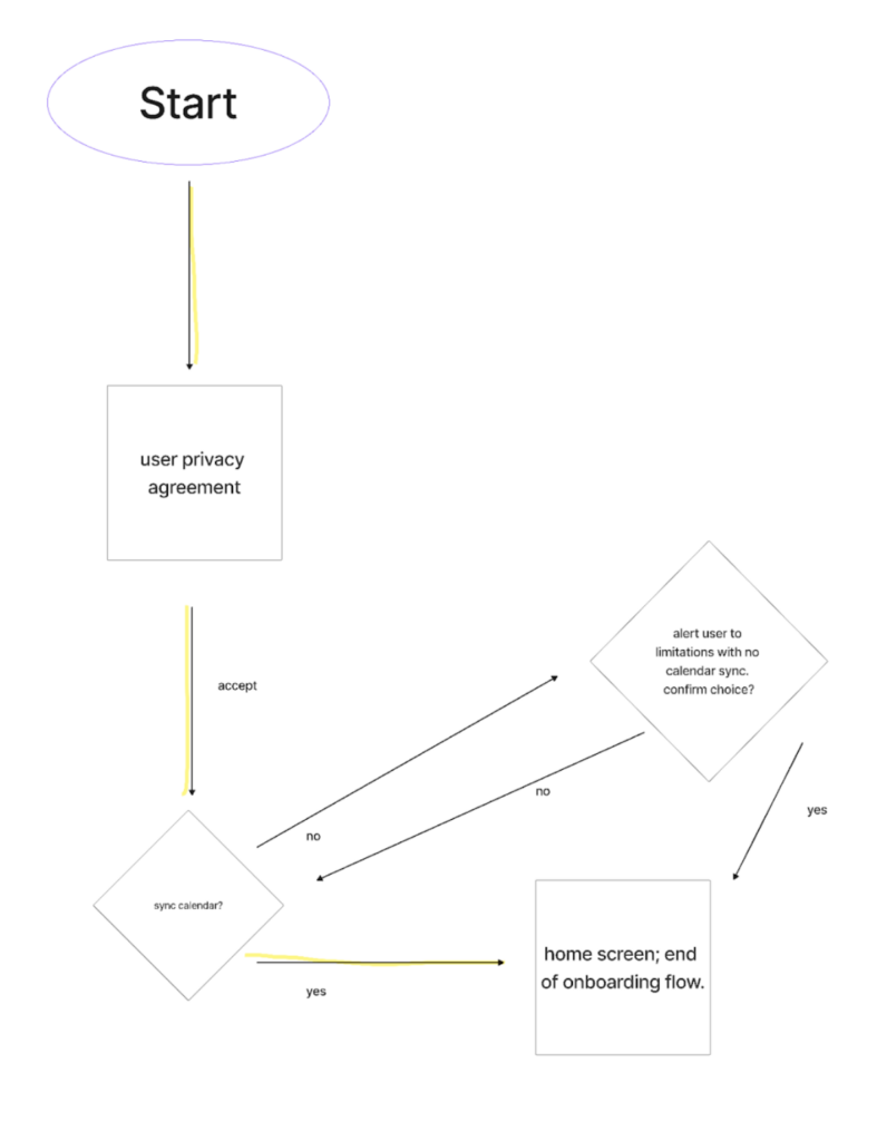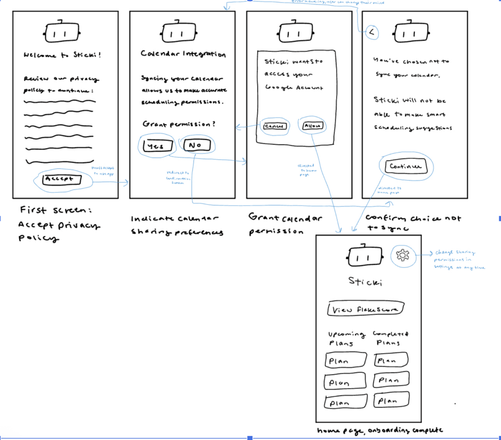 This onboarding flow is the default when users first use the app, though in subsequent uses they are directed to the homepage. In the onboarding flow the user reads and agrees to the privacy policy, which is required for usage of the app. They then have the option to sync their calendar or not (if they choose to sync there is a step simulating granting access). Users are then provided a summary of their choice for reference. The end of the flow directs users to the Sticki homepage.