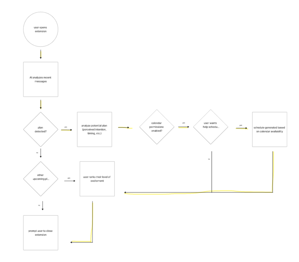 The user first clicks on the scheduling assistant to open it, and then they click through a series of steps in which the bot analyzes the conversation and finds appropriate scheduling windows. Each step includes more detail about how the timing was generated, based on feedback from usability testing. The generated calendar event is also editable based on user preferences. At the end of the flow, the user is redirected back to the messaging screen. These plans are then added to the user’s account and are displayed on the homescreen, enabling integration with flow 2.