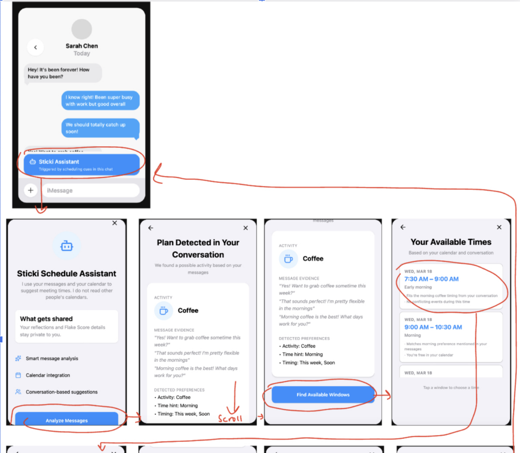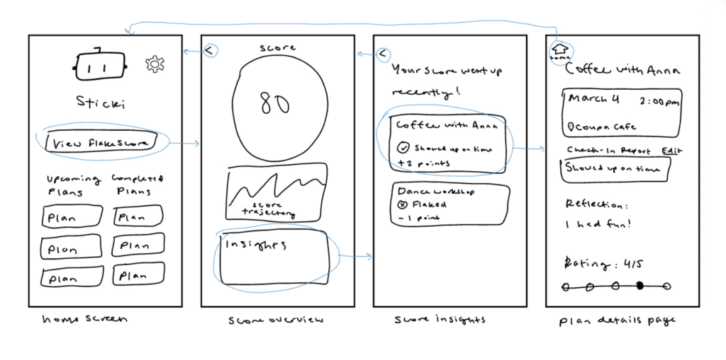 Sticki is an iMessage extension designed to help people make their plans actually happen. Targeting socially active Stanford students who want to be more reliable but struggle to follow through, our intervention combines three behavior change mechanisms: a scheduling assistant that detects vague plans in text threads and prompts users to lock in specifics; pre- and post-event check-ins that build mindfulness and meta-awareness around social commitments; and a dynamic FlakeScore that gives users a private, data-driven view of their own reliability over time. The core design decisions were to work within the messaging context users already inhabit to reduce context switching, and focusing on plan specificity as a driver of outcomes, and keeping scores private to avoid shaming. Taken together, Sticki’s multi-pronged approach works with the user to turn a hesitant “maybe” into a meaningful outcome.