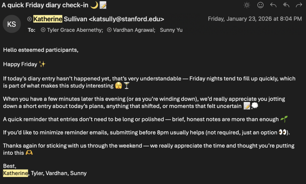 We ran a 5-day diary study over weekdays and weekends, paired with short pre- and post-study interviews. We had 8 participants, one of whom dropped out mid-study, leaving us with 7 complete datasets. The diary captured both quantitative and qualitative data: on the logistical side, participants logged counts of plans per day, whether plans were kept or changed, acceptance time, cancellation timing, distance from event start, and communication channel used. On the qualitative side, entries captured emotions at commitment time, reasons for uncertainty, what changed between committing and the event, and reflections on how the day’s commitments played out. Entries were submitted daily in a structured Google Sheet with a mix of short-answer fields and longer reflections, and participants could optionally attach artifacts like screenshots of messages to provide additional context. To reduce drop-off and keep entries consistent, our team sent daily morning reminders and conducted an evening check-in throughout the study window.