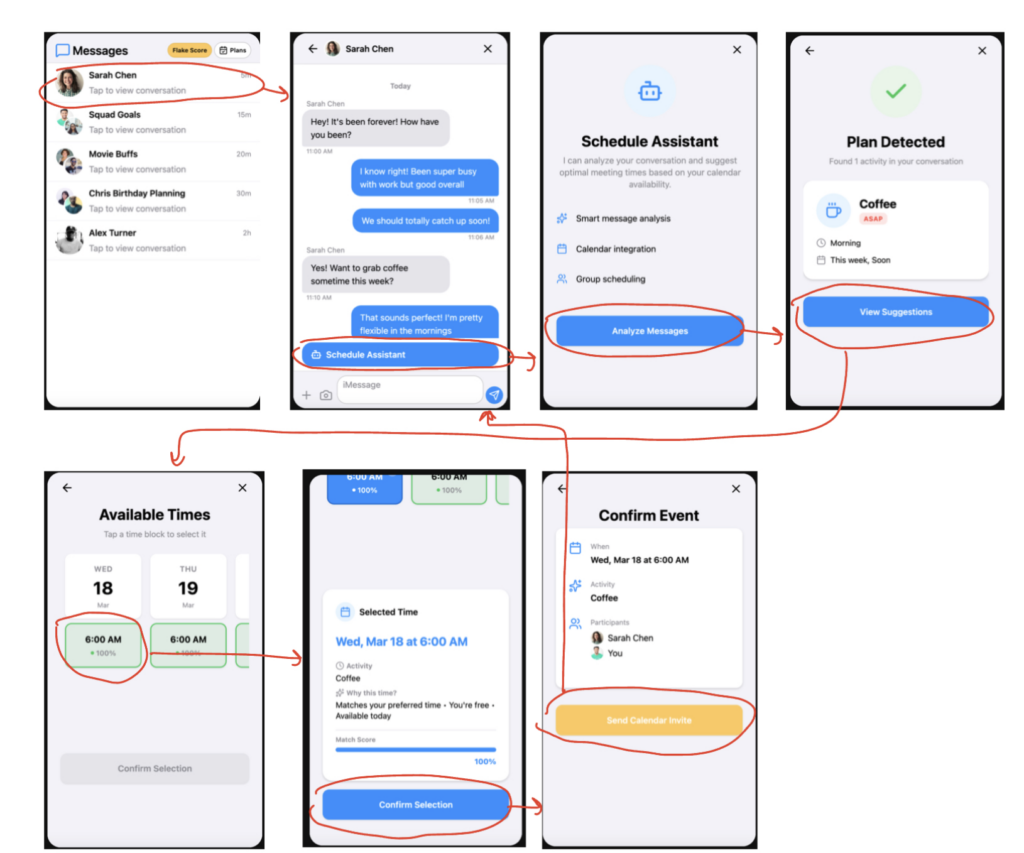 The scheduling flow is fairly linear, since the purpose is largely to do automated work and present it to the user for review and confirmation. Following group critique, we added more meta-information, such as screen captions, arrows, and circles, to highlight the user path on top of the UI sketches.