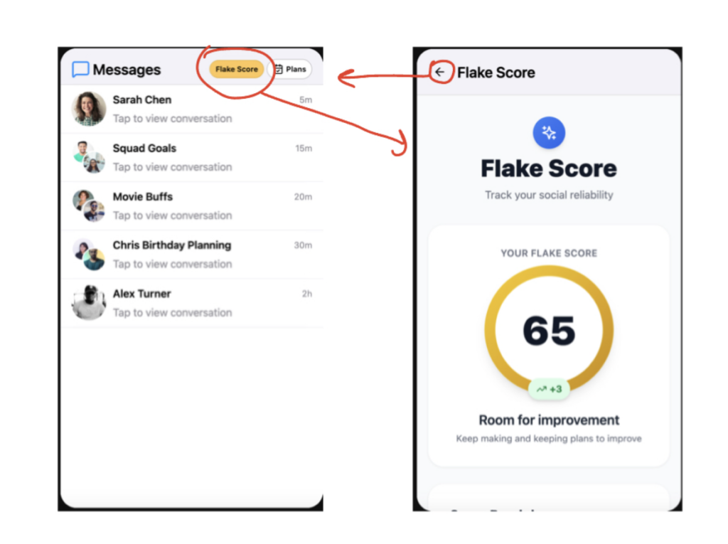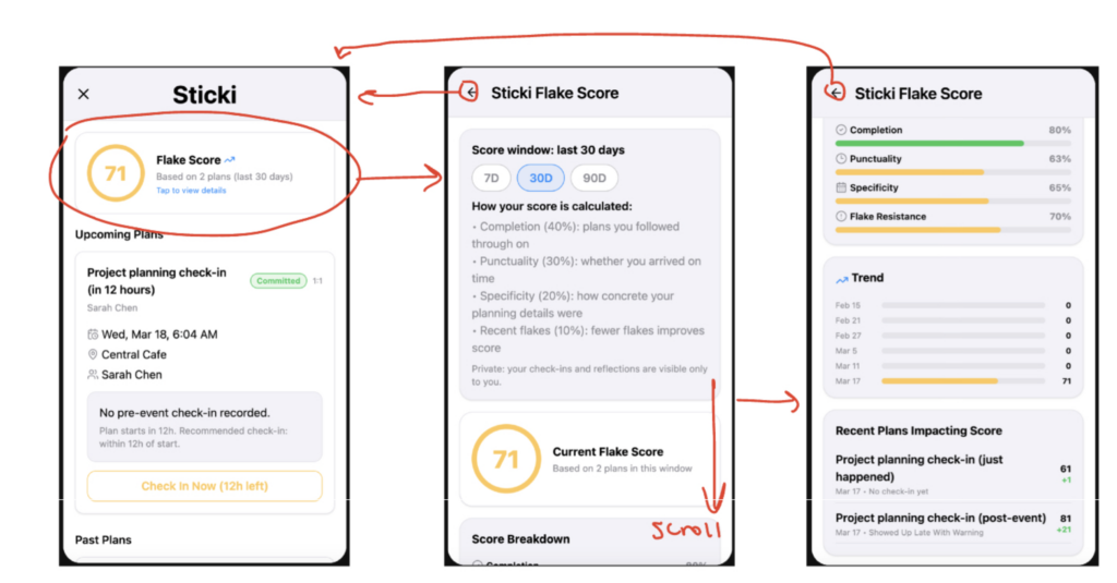 Sticki is uniquely positioned to address this because it intervenes at multiple points in the commitment process — not just when plans are made, but in the days leading up to them and in reflection afterward. By living inside iMessage, where plan-making conversations already happen, it removes the context-switching friction that caused participants in our study to abandon other tools. The check-in system directly operationalizes intentional reflection before or after a plan, meaningfully shifting how seriously users take their commitments. The FlakeScore’s private framing addresses a key tension our personas surfaced: users want accountability, but public pressure or shame-based mechanics create avoidance rather than motivation. Together, these features fill a key gap in the social planning space, promoting well being through healthy social behaviors.