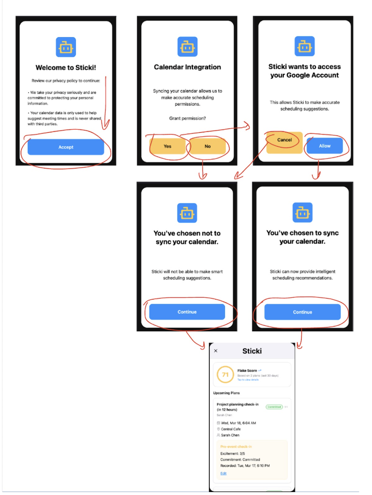 Happy path: Welcome → calendar integration → user selects “yes” → Sticki wants to access your calendar → user selects “Allow” → “You’ve chosen to sync” page → user selects “continue” → homepage
