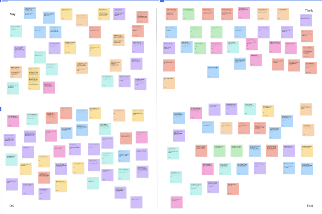 Across pre- and post-interviews and the diary study, we extracted key information onto sticky notes, color-coded by participants. Our full jam board can be viewed here.