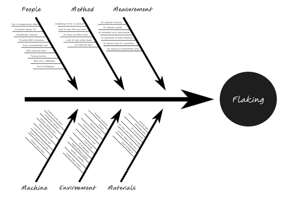 - Based on the above insights, we want highlight that different factors – people, method, measurement, machine, environment – can all contribute to flaking; and this is perfectly illustrated using the fishbone model