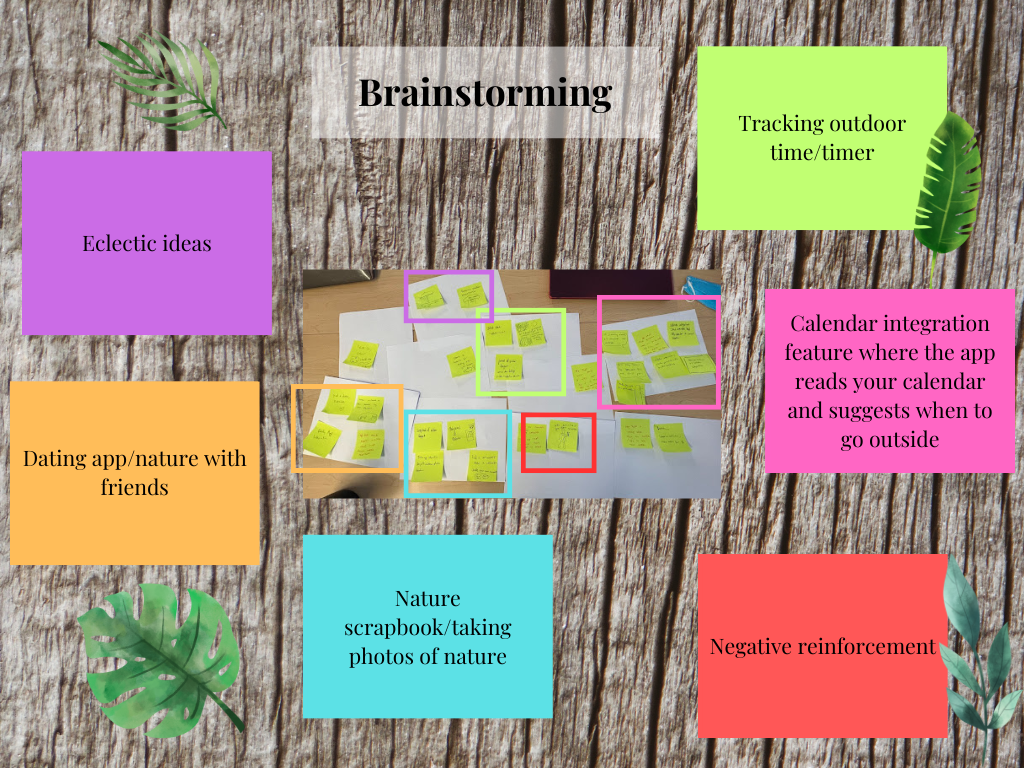 Our group is exploring how to encourage people to spend more time outside. With this in mind, we had a free listing brainstorming session where we identified a few different solution areas we could explore: Calendar integration vs. scrapbook vs. dating app vs. outside tracking.