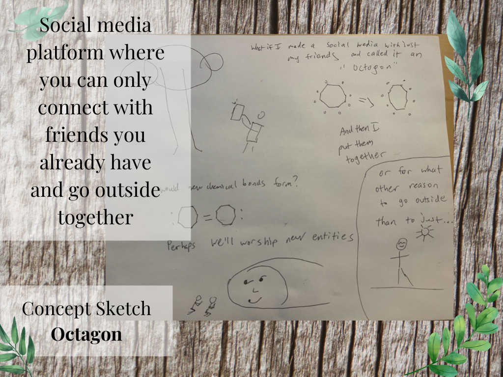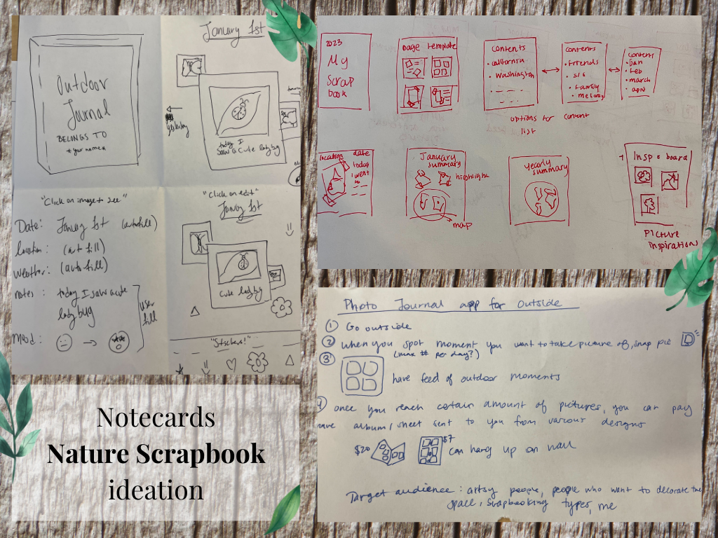 Each member of our group chose a concept from the brainstorming session that spoke to them and sketched out images related to their version of the idea. The sketches revolved around two central ideas: a nature scrapbook and facilitating outdoor activities with other people.