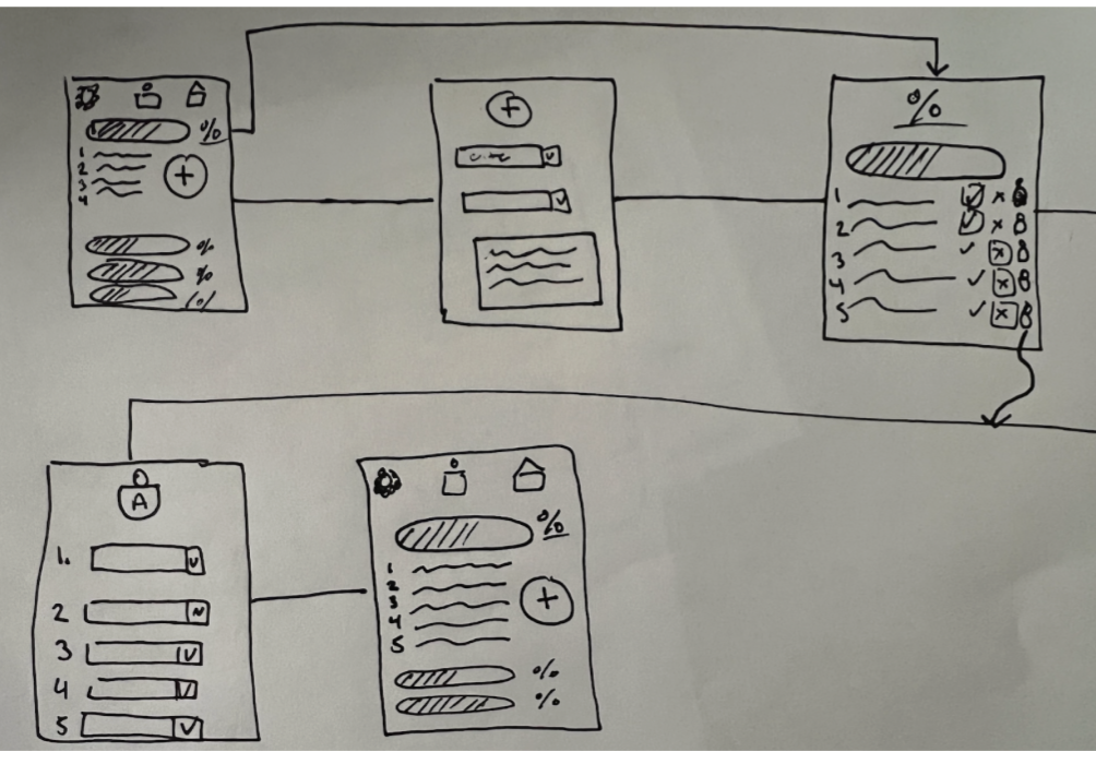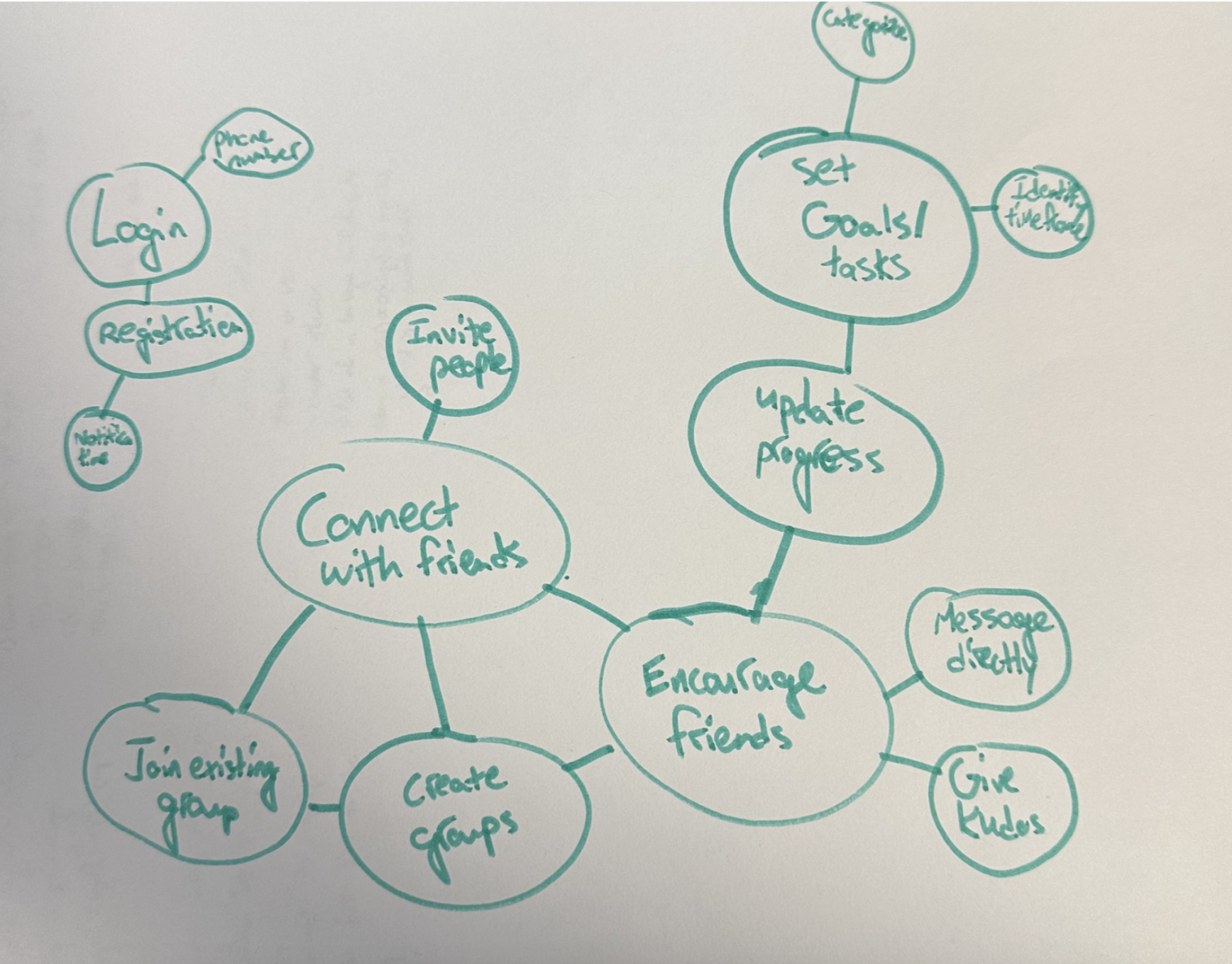 This image offers an alternate view of some of the key processes in our app, with the more important features highlighted with larger bubbles. In this example, connecting and communicating with friends is a primary feature that would likely resonate most with Unorganized Ursula because she is most likely to be motivated by social pressure. Seeing her friends get organized could be very helpful in prompting her own organization.