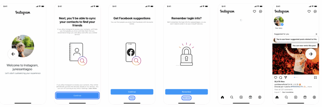 Social apps like Instagram’s onboarding focus primarily on building a personalized user profile (e.g, username and profile picture) and most importantly, syncing existing friend contacts quickly so users can find relevant content from their peers they care about. While Instagram explicitly asks users to sync contacts first, the app makes this optional with the “Skip” button (See Figure 1). As such, the business cost of this friction point is relatively low— not only can users skip this step, but they don’t lose much value from doing so since Instagram automatically creates a “Suggested for you” feed, suggested accounts to follow, and more on their Explore page (See Figure 1). In short, Instagram’s strategy allows immediate value delivery with low friction—I would estimate a 5-10% drop off rate when Instagram asks for contacts.