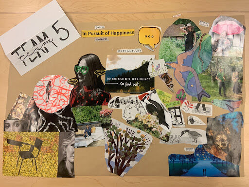 In this moodboard, I tried to capture a positive and playful energy. Yellow is a strong and reoccurring color because it creates warmth, feels inviting, and is associated with happiness. The image of the person in the middle contrasts the black and white, realistic photo with the colorful, poppy drawings on top. It shows that fun can be had even in situations where you wouldn’t expect it. Lastly, I included the smiling animals because they represented our application’s connection to nature in a goofy and abstract way. Overall, I think this aesthetic for the application would help users feel safe when playing and being silly in their photos, but it may also lead users to not take the behavior change messaging seriously.