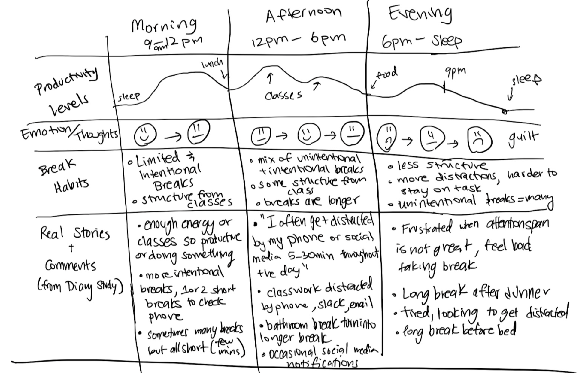 Over the past 10 weeks, I had the opportunity to work with my team and build studybuddies. Being a group of 3 was difficult, with us often feeling short-handed, but it made me realize how much my ideas matter and how important it was to recognize and rely on each other’s strengths. Most of this class consisted of new material for both my teammates and I, so sometimes I felt that the work we submitted was a reflection of our learning process more than anything that was necessarily polished, so sometimes I wasn’t sure exactly how or what exactly I would be graded on. Nevertheless, all of the hands-on work and iterative nature of the class helped solidify a lot of my learnings. I particularly enjoyed making system maps and journey maps (see the journey map I made below!). Both of these helped me consolidate a lot of the smaller tasks and ideas I had about the user and our app/product.