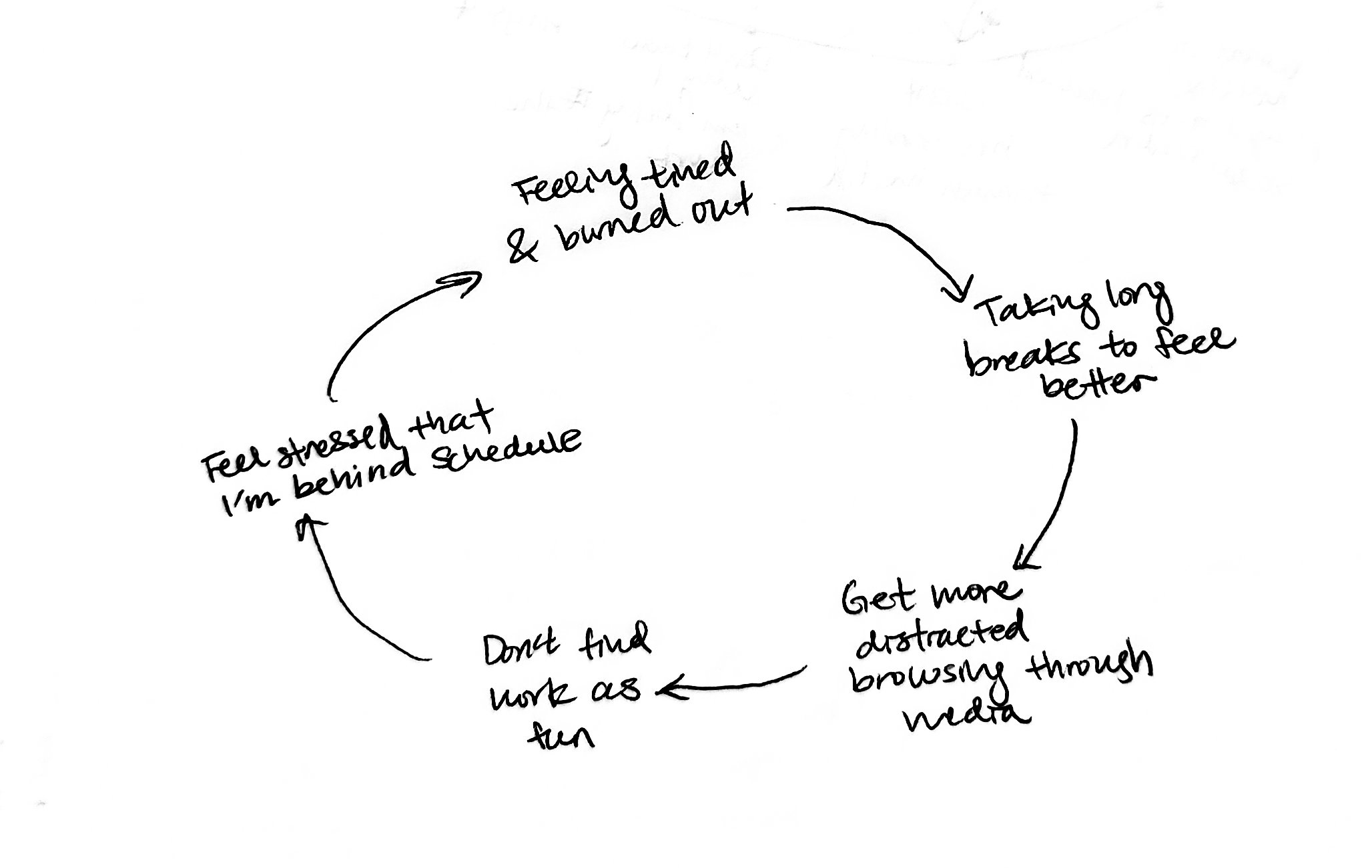 The behavior I targeted was taking disproportionately long breaks throughout the day and in between tasks. From Sunday morning to Monday night, I measured the amount of time I spent doing actual work versus taking a break. I took note of qualitative data with a connection circle and feedback loop model. On Sunday, I went to a friend’s house and studied and was able to focus on work for 5 hours with only an hour break in total. On Monday, I stayed in my room and tried to complete some upcoming deadlines. However, because there was a lot of assignments and the work required doing something I don’t feel good at and , I was disengaged and very addictive apps. This inadvertently lead to longer breaks. I found myself taking an hour long break for about only 20-30 minutes of work done. Near the end of the day, I decided to use a Pomodoro timer and surprisingly, it worked really well and I was able to focus for 45 minutes with 15 minute breaks. However, this was most effective for the first 45 minutes, and my performance started to decline on the second round. I also knew for a long time that I was mentally exhausted, which contributed to a lot of my behavior patterns, as seen in the feedback loop diagram. Next time, I will use Pomodoro more, and try working more with friends, as these helped the most with my time management.