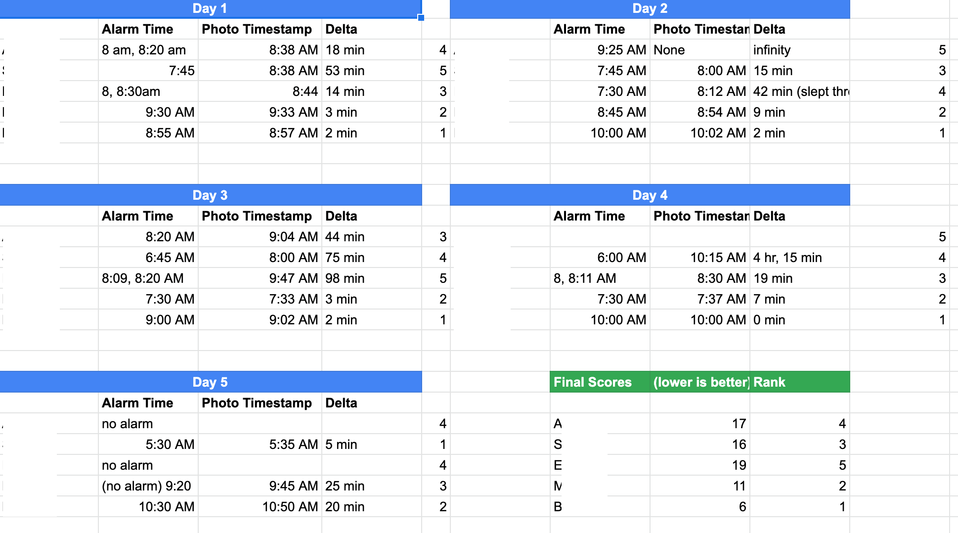 For our intervention study, we decided to focus on getting users out of bed as soon as possible. For five days, we had our participants send a screenshot of their alarms in the evening and text us a photo once they got up and out of bed. We would calculate the difference between their alarm and the time the photo was sent.