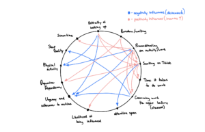 Experience and summary: The first insight I had uncovered from tracking my habit of opening up Tiktok is that it has embedded itself as part of my morning routine to get myself up. Across all three days, I woke up reaching for my phone and scrolling for approximately 30 minutes to fully feel awake. The contexts which I’d use my phone the most frequently in are when I’m bored (like when brushing my teeth… that’s a big problem), waiting for something (like in line at the package center), or when I need a mental break when doing work for an extensive amount of time. Some rare contexts in which I’d use Tiktok “with a purpose” (so when I’d open up the app to search something up rather than to watch the first 30 videos in my FYP) would be to get influenced or when I’m going shopping. I was at Sephora this weekend and needed lip color recommendations, and Tiktok has been my preference for that. Another interesting part of my habit is that I use Tiktok more when I have sudden or new interests, such as picking up a new game, which I would search on Tiktok just because I’m curious as to what the community might be saying on there. Like in the connection circle below, these causes for opening up Tiktok created multiple feedback loops (or moments in the circle where two arrows point at each other in opposite directions) where negative habits influenced more negative habits. Waking up late and needing Tiktok to fully wake myself up, for example, is influenced by me staying up late and scrolling through Tiktok because I can’t sleep or I was bored.