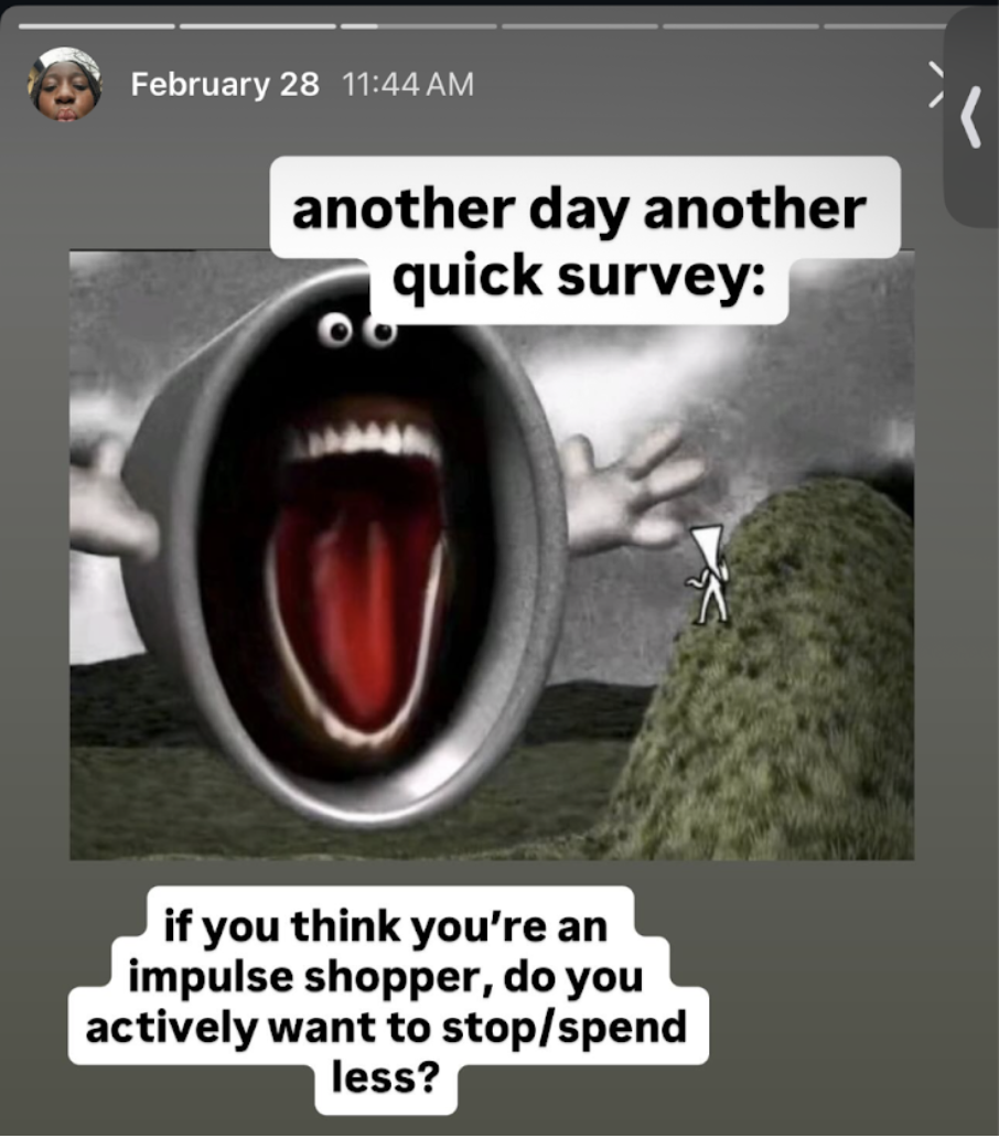 For this assumption test, I conducted a rapid survey with close friends; because there wasn’t as much time to collect a pool of impulse spenders as there was with our past few studies, I chose to ask people who were comfortable with me about their spending habits so that they wouldn’t feel the barrier to an honest answer that I anticipated others might. I asked this question in a low-stakes, casual manner: if you consider yourself to be an impulse spender, do you actively want to stop/spend less? I let this poll hang amongst viewers for 24 hours, and within this timeframe, here’s what 14 responses showed: