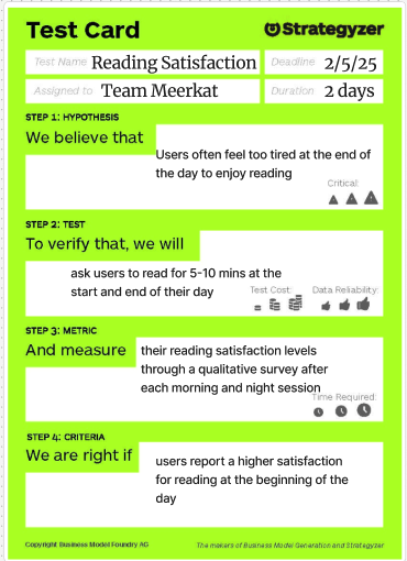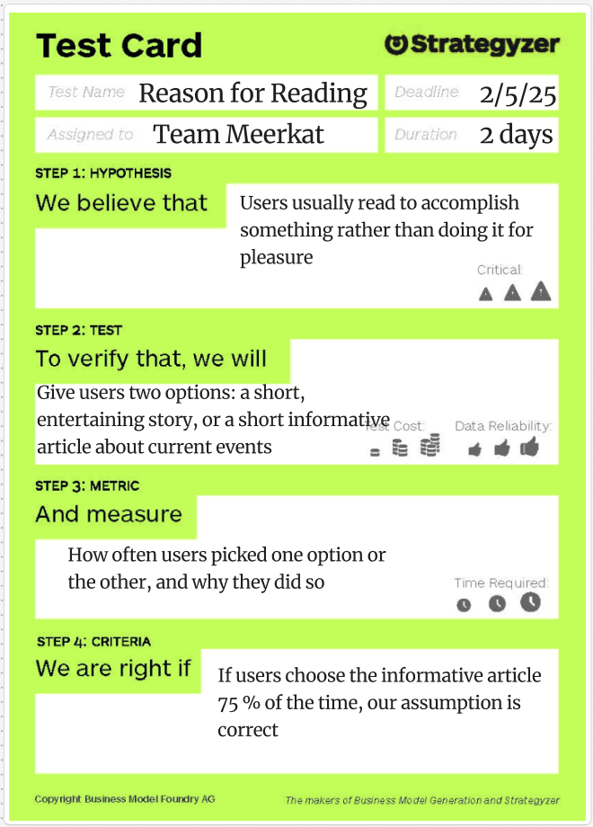 Lastly, this experiment was designed to test the assumption that users (remember, our target audience is mostly college students) don’t really like to read for fun – they prefer to read to accomplish something or learn something new. After giving each of the users two options, a short entertaining story or an informative article, we found that 3/4 of the users picked the informative article. Therefore, the “we are right if” was correct because that represented 75% choosing that category. The takeaways from this are that college students (and young professionals) largely prioritize gaining knowledge when they read, and it was interesting to see that the one student that chose the short story was someone who already likes to read in her free time. As a result of this, we think that one approach to building a product could be encouraging or helping users find reading material that benefits them rather than being just for fun. Or, similar to the first test, perhaps it would be best to tailor these readings to the user.