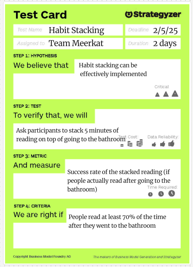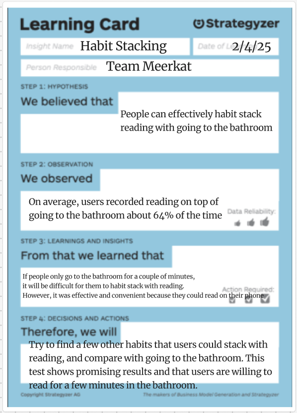 For this experiment, we wanted to test out habit stacking, which is one of the concepts we had discussed in class. There are many different habits we do every single day, and we chose to experiment with going to the bathroom because it’s a habit everyone does multiple times per day, and often involves sitting down in peace. We found that on average, the users recorded reading while going to the bathroom about 64% of the time, which almost reached our “we are right if” goal of 70%. One key takeaway from the experiment was that habit stacking needs to give the user the opportunity to meaningfully engage with the target habit. In the case of going to the bathroom, users were sometimes only able to read for a minute or two, which isn’t always ideal. While the bathroom habit stacking seemed to be effective in getting users to read, it may be more realistic to read while going to the bathroom only if they’re going to be in there for more than a minute or two. Looking forward, we will try to find some other habits that users could potentially stack with reading, and compare pros/cons of those habits with going to the bathroom. Most importantly, this test showed that people were willing to read while going to the bathroom, so this is a promising result.