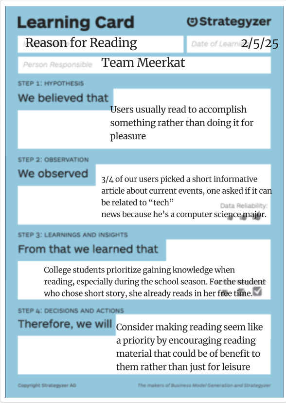 We recruited four people for the reason for reading assumption, and three people for the other two. The users we recruited were a combination of young professionals and students, and some of them read often while others don’t read very much. The target audience for our product is college students and young professionals who want to build a habit of reading regularly, so we made sure to choose participants that wish to read more.