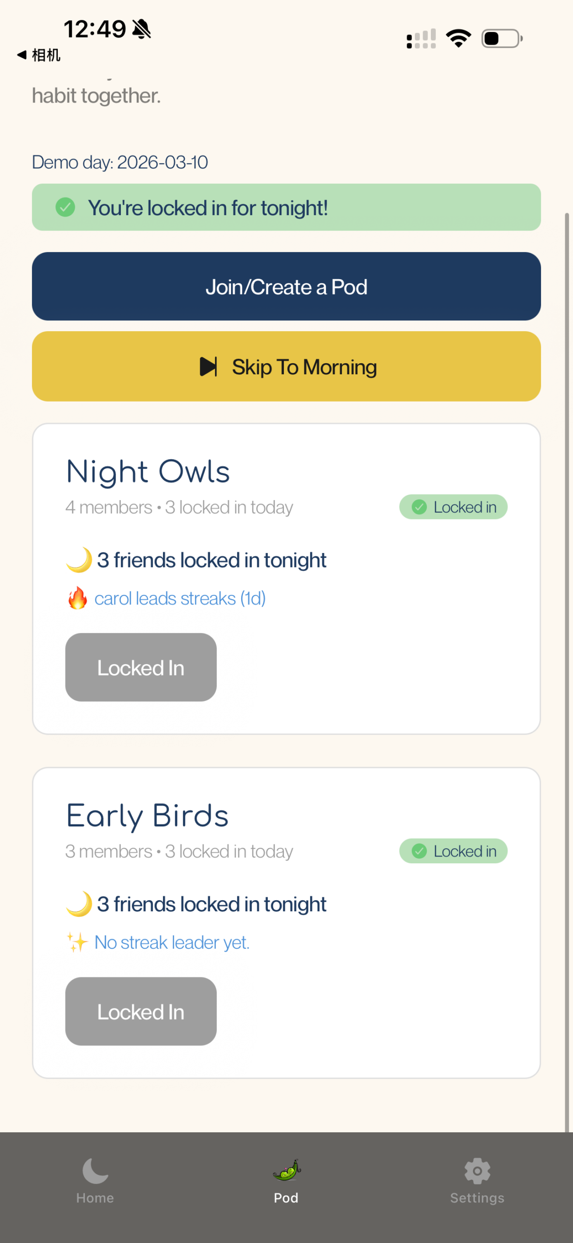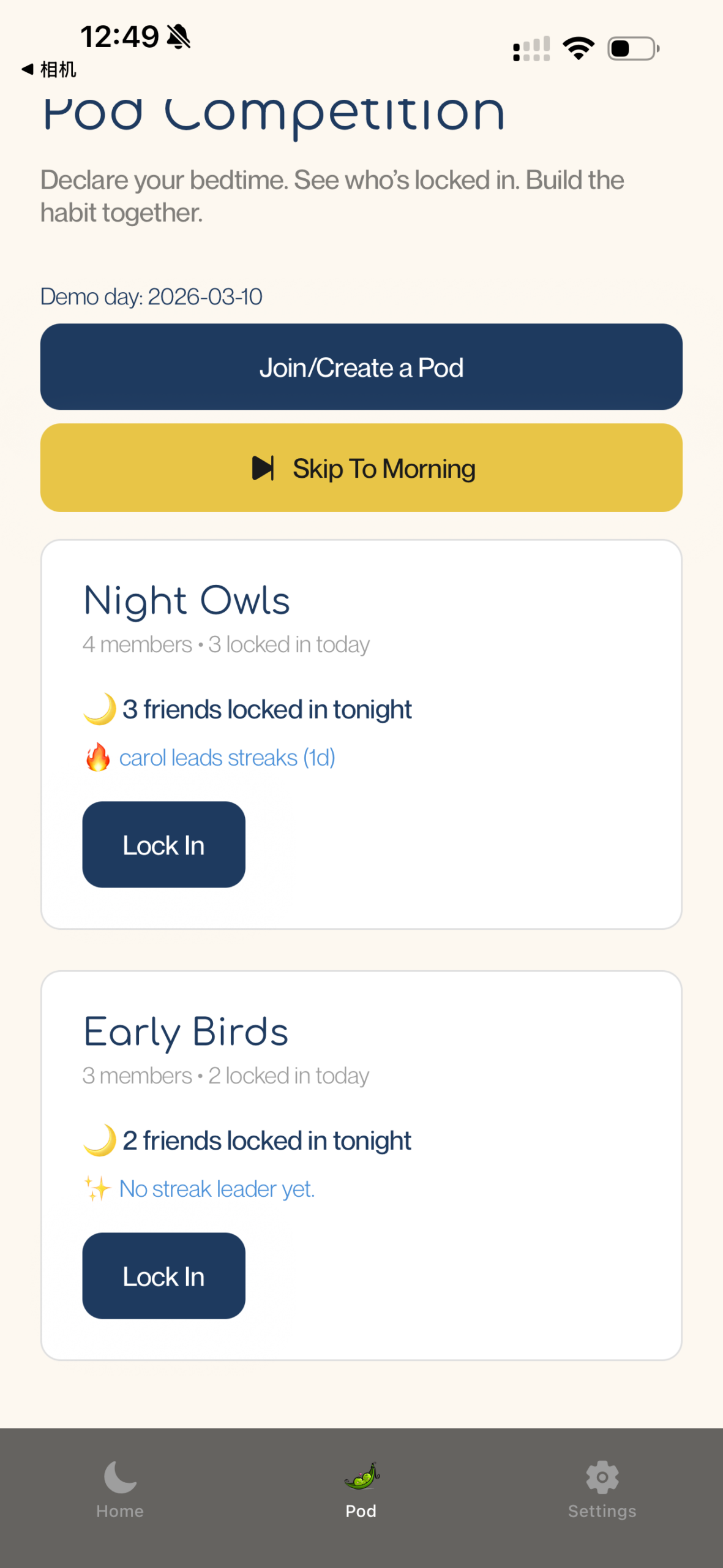 We believe that users will feel motivated by Sleep Pods and social accountability, like seeing friends’ progress, streak pressure, and light competition, rather than feeling judged or turned off by it.