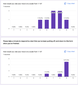 This screenshot from our response form shows the moods that participants had before and after responding to a text. On a general level, it’s clear that participants experienced heightened moods after responding to a text.