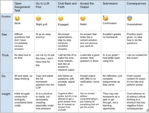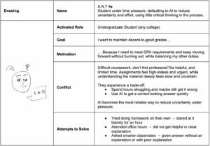 This journey map shows how this persona typically uses LLMs from the moment they open their assignment, to the future consequences. It unpacks their actions, as well as their emotions, thoughts, and insights throughout the process. A key takeaway is that these students don’t intend to “take the easy way out”, nor are they “just lazy”. Rather, the behavior is rationally driven by uncertainty and time pressure. As one participant explained, “Out of ten [LLM outputs], if nine are correct and one is wrong, that’s fine. The time it would take to cross-check everything doesn’t feel worth it to me.” The persona accepts AI output once it feels “good enough” and moves on, valuing speed and momentum over verification. This student even described LLMs as a default place to go when they have a question, and they did not see an issue with being dependent on it. In the short term, this workflow feels efficient and satisfying that they’re getting stuff done, but the journey map shows how the lack of reflection or engagement comes back to bite them once it is exam season.
