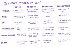 For my persona, I focused in on an office employee who works a desk job, and more specifically, one with back pain. I chose this because I found through my interviews that pain is a huge motivator for many to try and improve their posture. For the corresponding journey map, I included environment, social factors, and pain in addition to think, feel, and do because I felt that these categories covered a lot of the experiences related to posture that were mentioned throughout our team’s interviews.