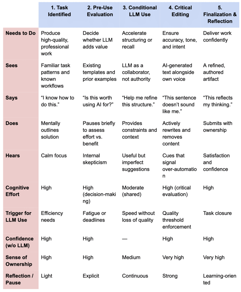Travis represents a contrasting yet equally important segment: expert users who deeply value agency, authorship, and critical thinking, even while using LLMs extensively. This persona highlights how intentional pauses can enhance high-skill workflows. Travis is crucial for understanding when and why users choose not to rely on LLMs.