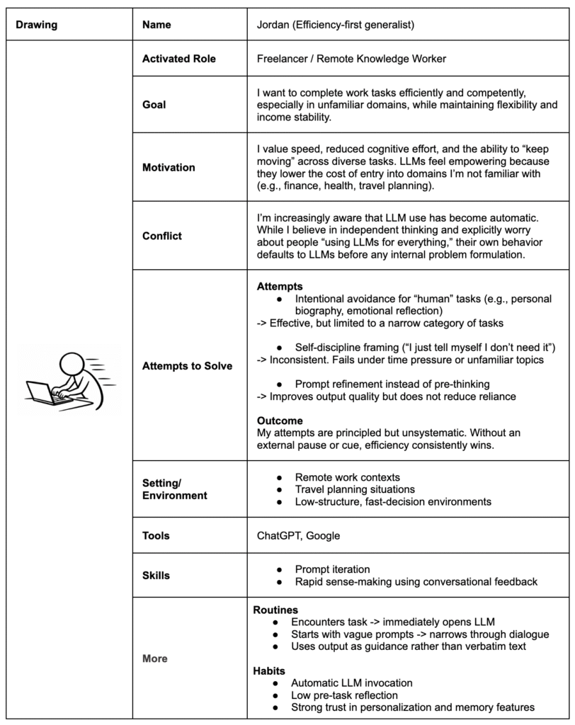 Jordan represents users who have rapidly integrated LLMs into everyday workflows and default to them as a first stop for problem-solving. This persona is critical because Jordan exemplifies habitual, low-friction LLM use, where reflection is minimal and value is measured primarily in time saved and cognitive offloading, not learning or authorship. This makes Jordan an essential persona for evaluating risks of automatic reliance and opportunities for lightweight pre-use intervention.