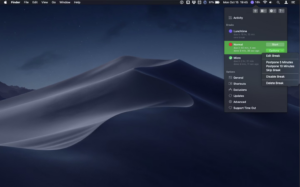 Time Out is an app for macOS that provides users with gentle reminders to take breaks regularly. It prompts users to take “normal” breaks (about 10 minutes every hour) for users to move about and relax, as well as “micro” breaks (brief 15 second pause every 15 minutes) that remind users to not tense up. This app’s main strength is that its settings are highly customizable, allowing users to choose the time between different types of breaks, how long the breaks last, as well as add different types of breaks. Additionally, the app detects when users take a natural break (e.g., taking a short nap on their desk or getting up from their computer to go to the bathroom) and skips the scheduled breaks during those moments. It also features an activities feed, which is designed to help users keep track of their time by showing the usage of various applications on their computer. During breaks, there is a progress bar that allows users to see how many minutes are left in the current session of their break, and there are also different buttons in the app to help the users defer or skip their breaks.