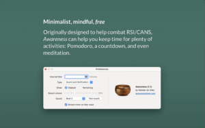 Awareness Timer is a macOS timer app designed to merge with users’ workflows in order to ensure that they incorporate time for physical activities into their schedules. It was initially designed to help users combat pain in the arms, neck and shoulders, which can result from extended periods of sitting. The app can be accessed from the Mac’s menu bar and is designed to remind users to move after a set duration of time has elapsed. The app includes a Pomodoro, countdown timer, and a feature designed to help users meditate. The app has a number of strengths, for example when the timer elapses, the app gives the user a gentle reminder through a pop-up notification which stays at the top of the screen or by playing a sound. The app also has a silent mode feature which allows users to check the timer discreetly during moments when notification reminders would be disruptive to their workflow. The app design also makes it useful for users who want to practice guided breathing or meditations during their breaks.