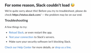 Slack’s error message that says “For some reason, Slack couldn’t load” combines warmth with clear instructions. It offers links to reload, test the connection, or check the service status. This transparency helps users feel in control and prevents frustration. It also protects workplace retention, which is the company’s main source of revenue. The message uses a friendly tone and turns a stressful moment into something manageable. Adding an estimated recovery time or a short progress indicator could make users feel even more supported.
