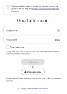 A banking error is one of the most sensitive situations for any product. Wells Fargo’s login message that says “That combination doesn’t match our records” is calm and professional. It avoids alarming language and offers recovery links to reset credentials. This keeps the interaction composed and protects trust in the brand. To reassure users even more, the message could include a note that accounts remain secure and no suspicious activity has occurred.