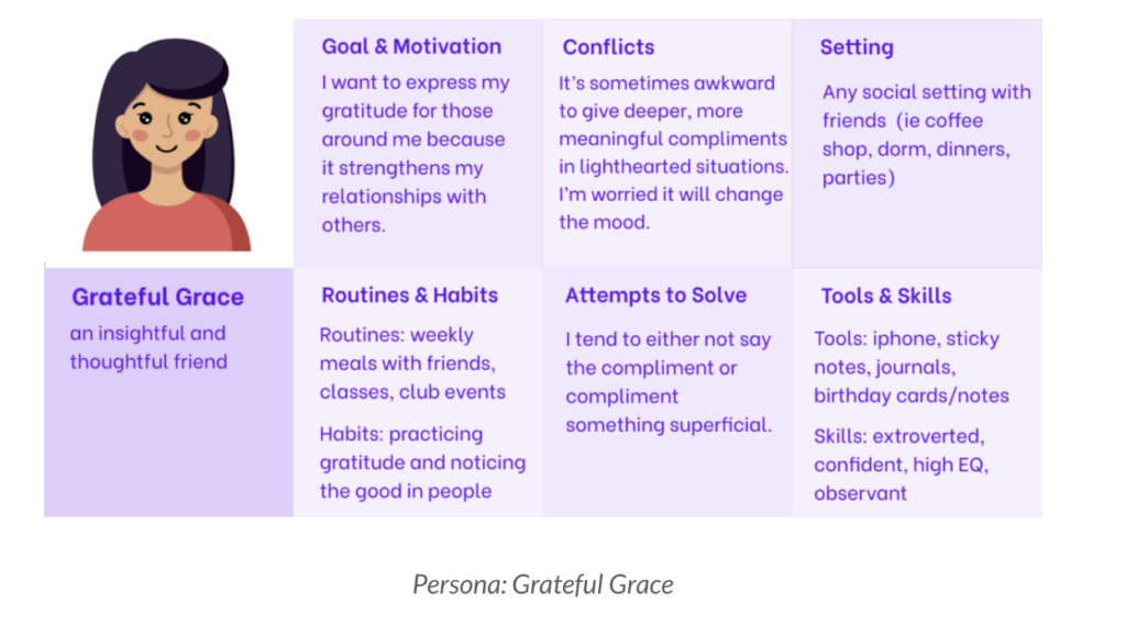 My favorite activities in the class were persona-building and the intervention study as they both helped my team define the users we are building for and what are the most important tasks for our users. I’ve seen the power of personas in industry before, so I was excited to build our own. Building our personas, Grateful Grace and Nervous Nick, allowed us to better understand the needs, goals and pain points of our users. It brought our idea to life in a way and also created unity within our team as we would talk about features in our app in terms of these personas for the rest of the quarter. I also loved our intervention study because it provided invaluable feedback and reinforced that our idea was good and would be used. I mostly ran the study by myself as I was the moderator texting compliments back and forth. It was the most fun study I have ever run as seeing the compliments that friends were giving each other made my day. After analyzing the results, we were able to identify patterns and trends and understand the context behind the behavior of giving compliments. In the past (i.e. 147), I never discovered big insights from studies because they seemed rushed and didn’t have a specific purpose, so I was really happy that the studies in this class didn’t feel like that at all. My favorite class throughout the quarter was definitely the class about colors. My new goal is to now create a company in which people all around the world can identify the product based on a single color.