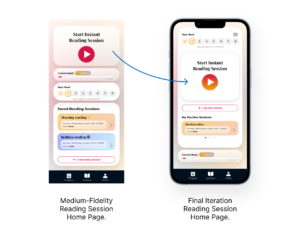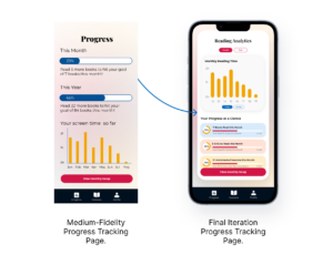 - Main issue addressed: Severe Issues: Lack of clear visual hierarchy in progress page, unclear and lack of immediate feedback in progress tracking (users wanted more progress indicators beyond the “wrapped” feature). Trivial Issues: Fixed text discrepancies (ie. “Screen time” instead of “reading time”).