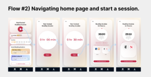 The first screen shows a user on another app. Our app tracks social media usage and alerts the user when they’ve spent excessive time on it, prompting them to read instead. If they ignore the alert and return to social media, the app will repeatedly trigger the timer and alarm, making uninterrupted browsing impossible. When redirected to our app, users can switch to a reading app (e.g., NYT, The New Yorker) or log non-digital reading. After a user-set duration, they can return to social media if desired.