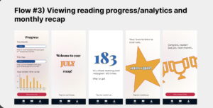 There are two main features to be outlined here. One is an overall progress display that will likely take the form of a graph but with some customizable features so that users can control how they view and interpret their own reading progress over time. We also included a feature that is inspired by “spotify wrapped” in that, if users want, they can view their reading statistics for the last month. Once they choose to do so, they will click or swipe through the following screens until the recap is complete.