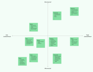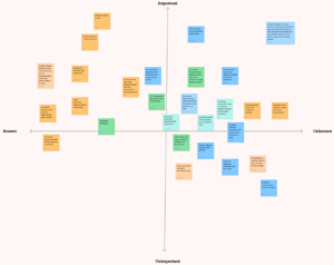 To begin our assumption testing, we created an assumption map that characterized different ideas and insights found from our baseline studies across two different axes: the knowability/discoverability of something, the importance of that thing. This allowed us to clarify which problems areas we should hone in on when coming up with and storyboarding ideas.