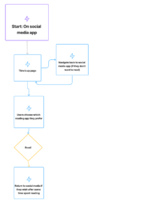 From there, we added on the sub-bubble of “goals” and “registration/log in” to the “home” page. For our “app switcher”, our individual bubble maps showed that there is a cyclical nature to that functionality, which we reflected in the synthesis. This is also where the connection to other apps happens, cycling between the vice of choice (tiktok, instagram, candy crush) and the reading material customized by the user.