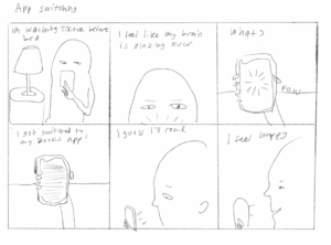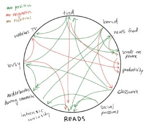 - From the feedback loop, we can see that scrolling on one’s phone is a behavior that results from being tired, bored, or going through one’s news feed. This reflects how there is so little friction associated with scrolling on one’s phone – one just has to unlock the phone and everything is at one’s fingertips, as opposed to reading, where there is more friction (one has to make the conscious decision to do something more out of the ordinary and less dopamine inducing)