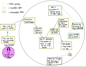 To create this system path, we followed Inda’s thought process. As a busy, goal-oriented college student who understands the importance of outdoor activity yet considers herself unathletic, she wants quick, efficient, and low-effort ways to engage in outdoor activity. The path reflects this understanding, and places emphasis on a low friction process. Simply by inputting her schedule, which she already has ready and updated as a busy and motivated student, the rest of the work is handled by the AI, which identifies free blocks of time in her day. Next, she receives nudges in the form of text messages that remind her to go outdoors, placing emphasis on what she personally values: easy, quick activities. If she responds to the nudge and goes outdoors, she has the opportunity to reflect on her experience, and her positive progress and experience will motivate her to go on a walk with the next nudge she receives as well.