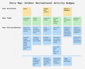 The user flow led to the development of several key MVP features based upon this analysis. Specifically, we realized the first step was the upload schedule step. It is necessary to *accurately* account for the user’s schedule so the nudges are actionable. Thus, some sort of Google Calendar integration or ability for the user to manually input/edit the schedule is necessary. Next, we heard from users and see in the story map that having control over frequency of nudges is important as well as inputting the phone number. From the study map, we realized this needs to happen soon in the flow, otherwise nudges cannot be sent. We also realized that our personas would appreciate logging activities in order to later see accomplishments, and thus, these became MVP features. Finally, another takeaway was that tailoring the nudges would be beneficial after the end reflection process in our story map. The user is able to go through a cycle of improvement, and mapping the story map helped us recognize this possibility.