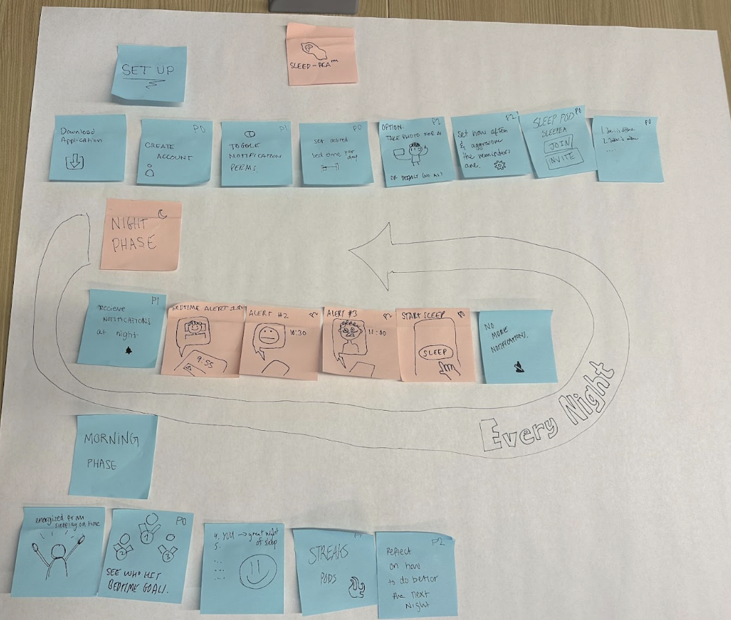 Creating this bubble map helped us see SleepPea as two interconnected systems: Personal Bedtime Goals on the left side, and Social Bedtime Goals on the right side. On the left, Setting Bedtime Goals (target bedtime, hours of sleep per night, notification preferences) feeds into Sleep Tracking, which pulls from either the user’s self-reported sleep time or Health Data to monitor whether goals are actually being met.