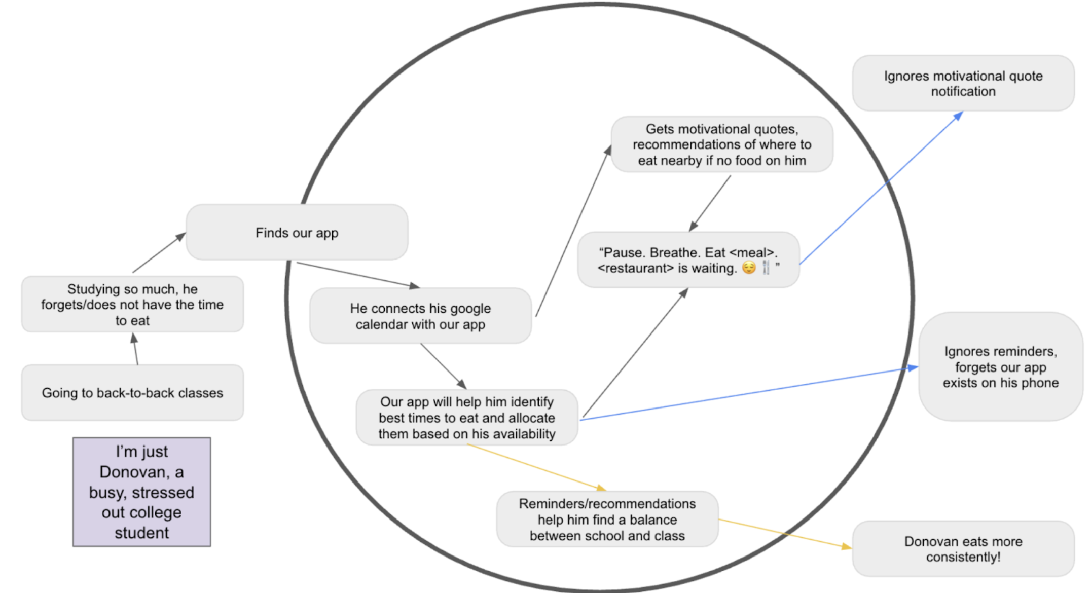 Our team started with the core goal (the gray circle) which was to help people create consistent eating, which is ultimately the behavior we’re trying to change. We brainstormed solution directions and turned the biggest ones into the main bubbles