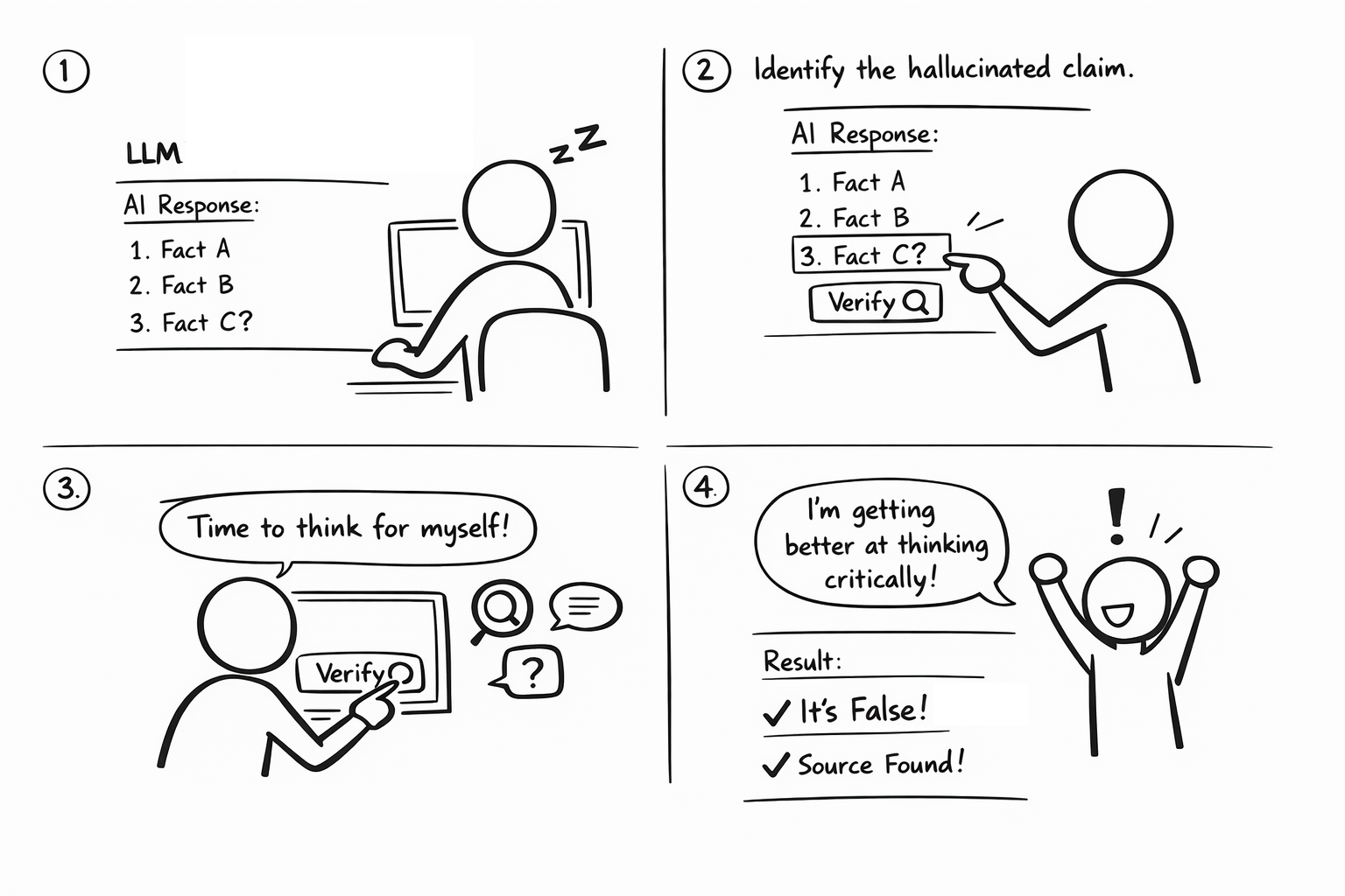 - Trains skepticism by prompting users to identify which claim needs verification.