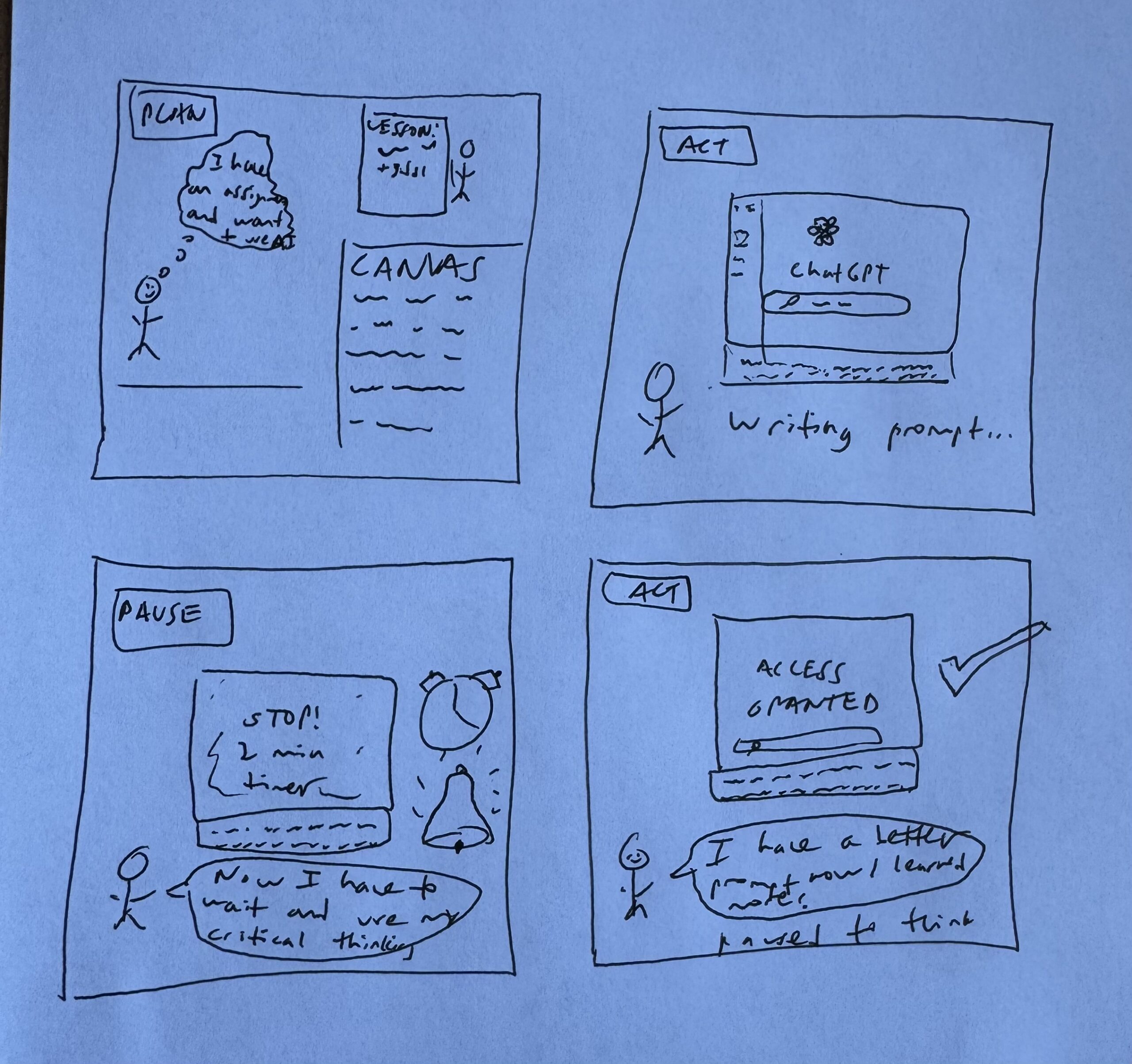 - The user must refine their plan before unlocking the LLM response. The LLM determines when the user has done sufficient thinking on their end. It frames it as beneficial to the student to help them improve the prompt and provide more specific concept to improve the output of the LLM.